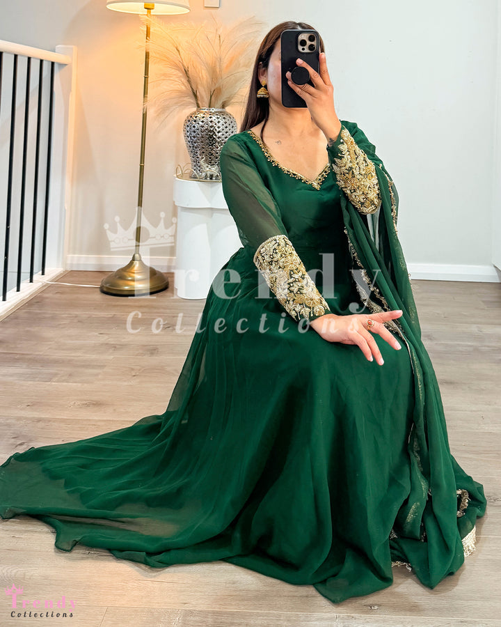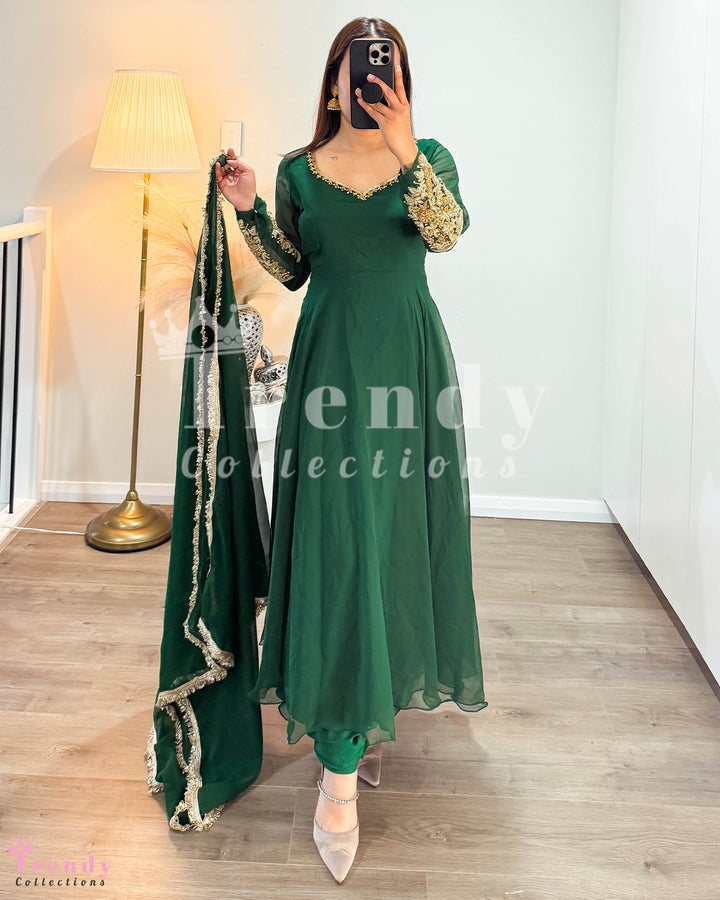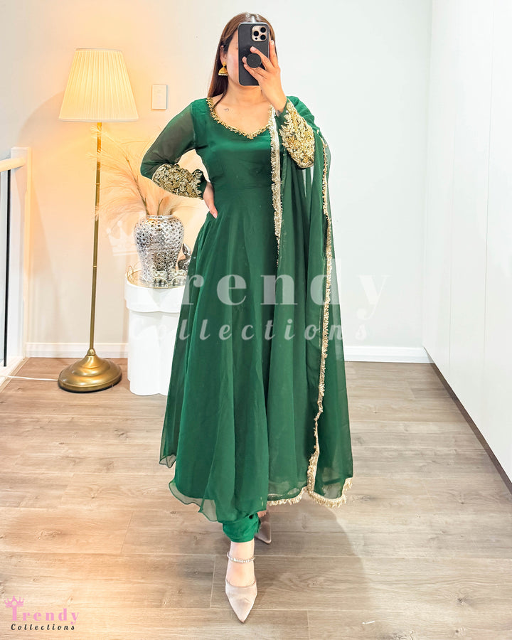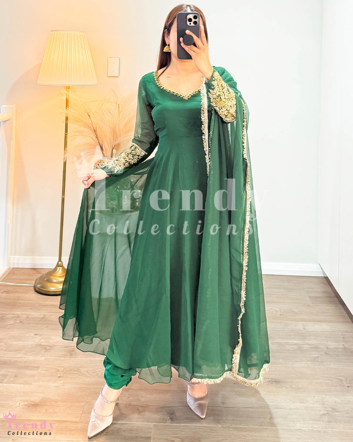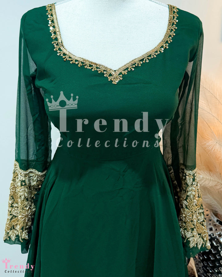 Anarkali Set with Beads Hand Embroidery - Green (Sizes 34 to 42 available)