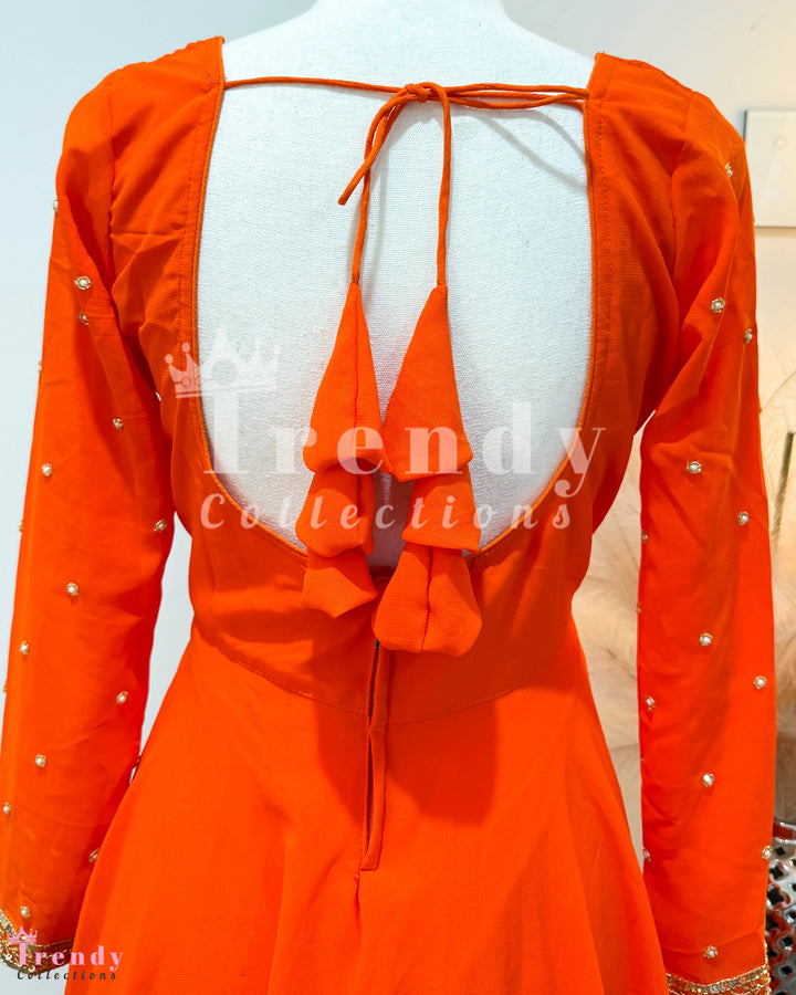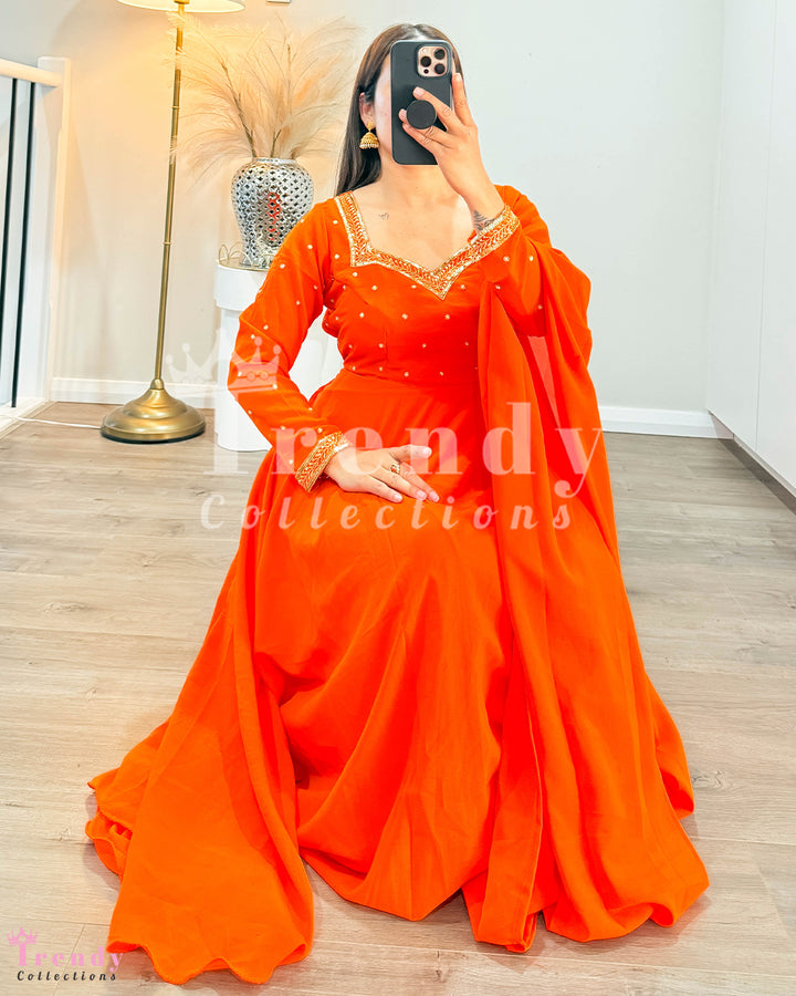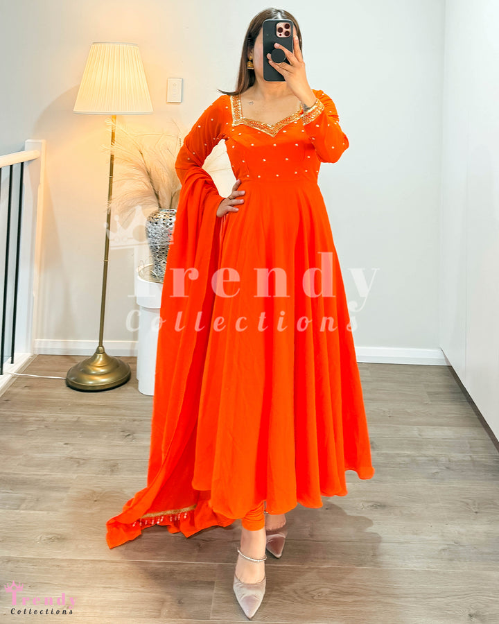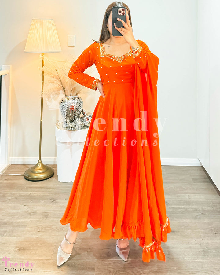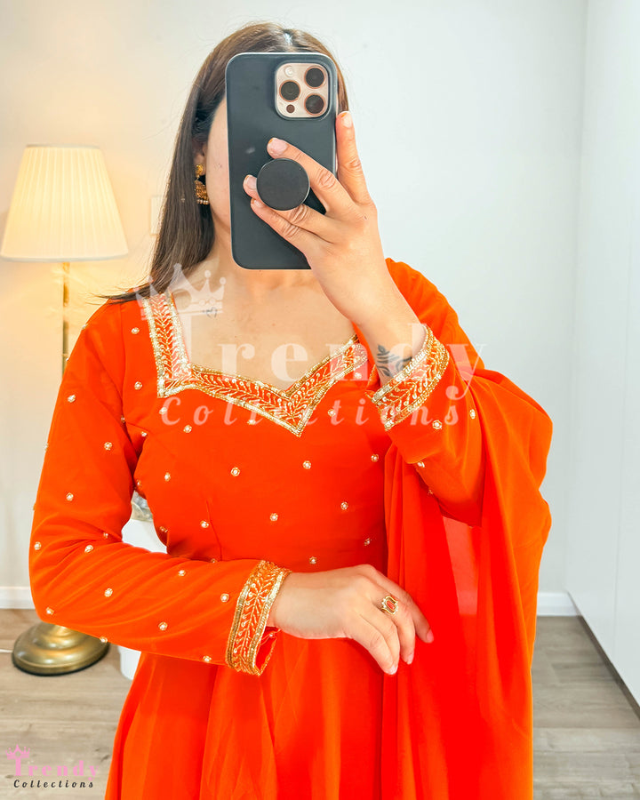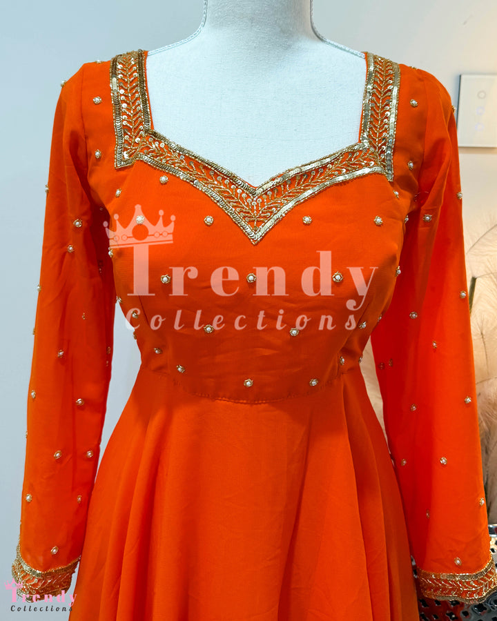 Anarkali Set with Beads Hand Embroidery - Orange Colour (Sizes 34 to 42 available)