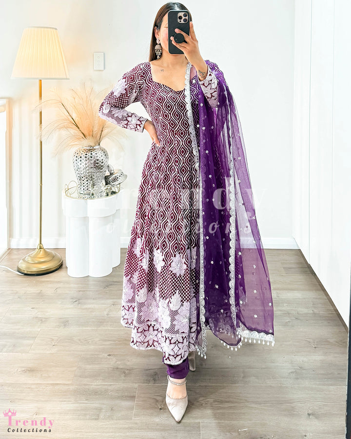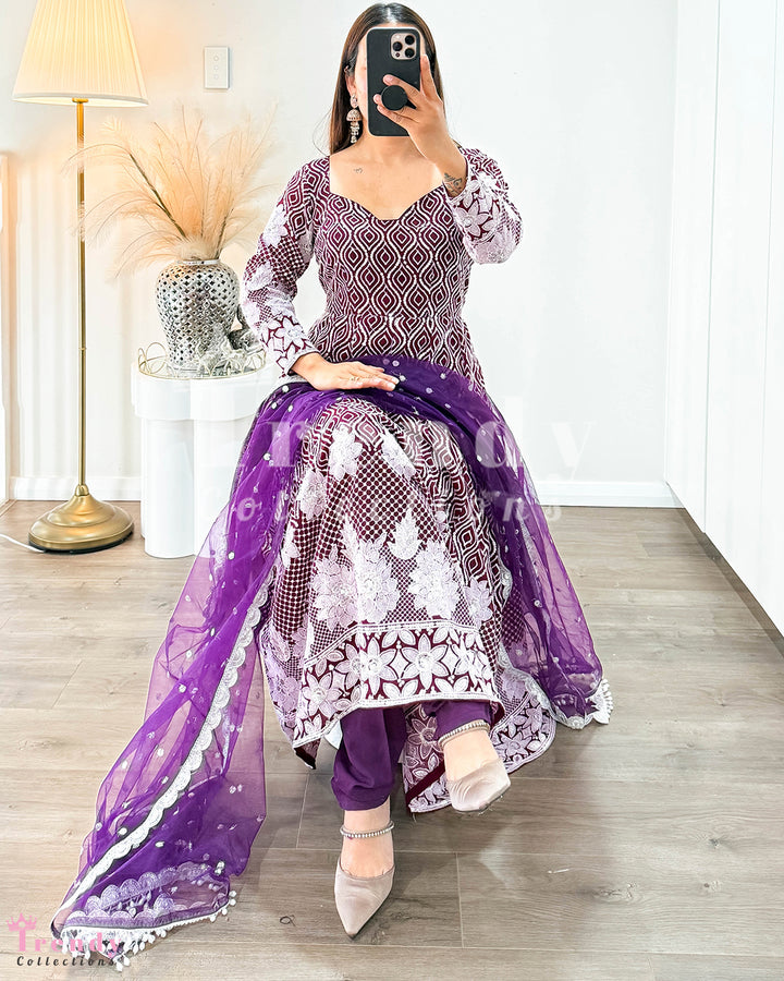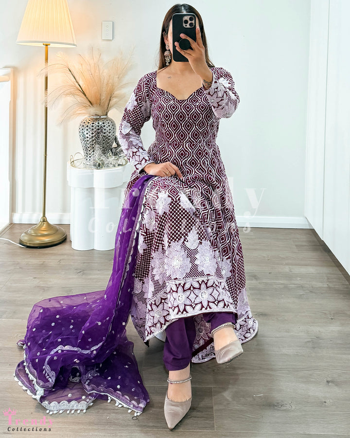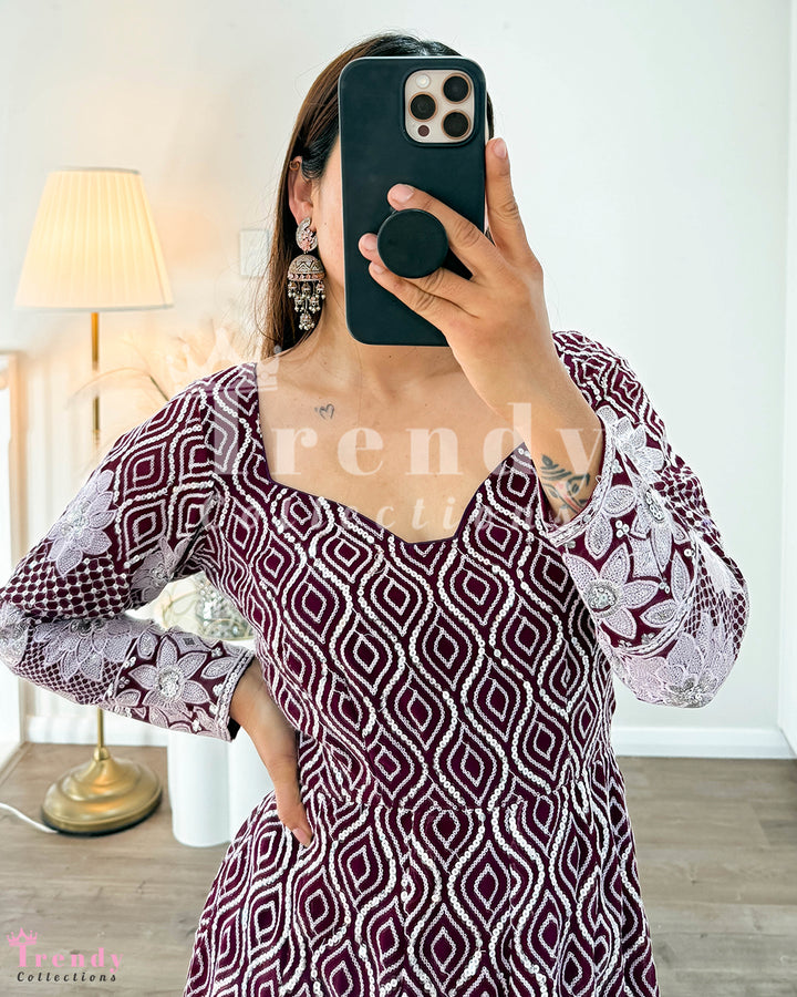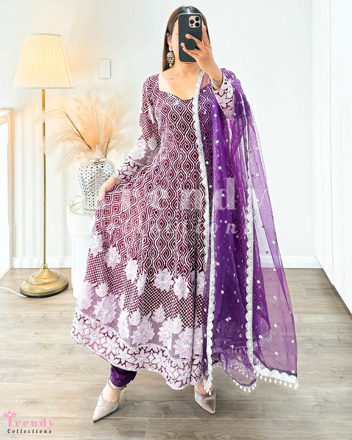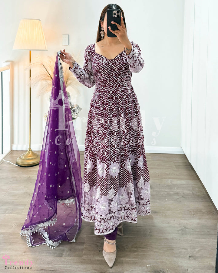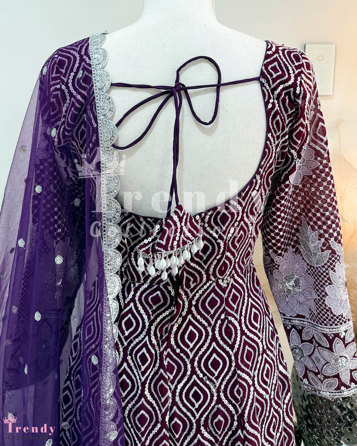 Anarkali Set with Heavy Thread & Sequin Work - Dark Purple (Sizes 32 to 42 available)