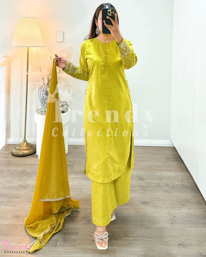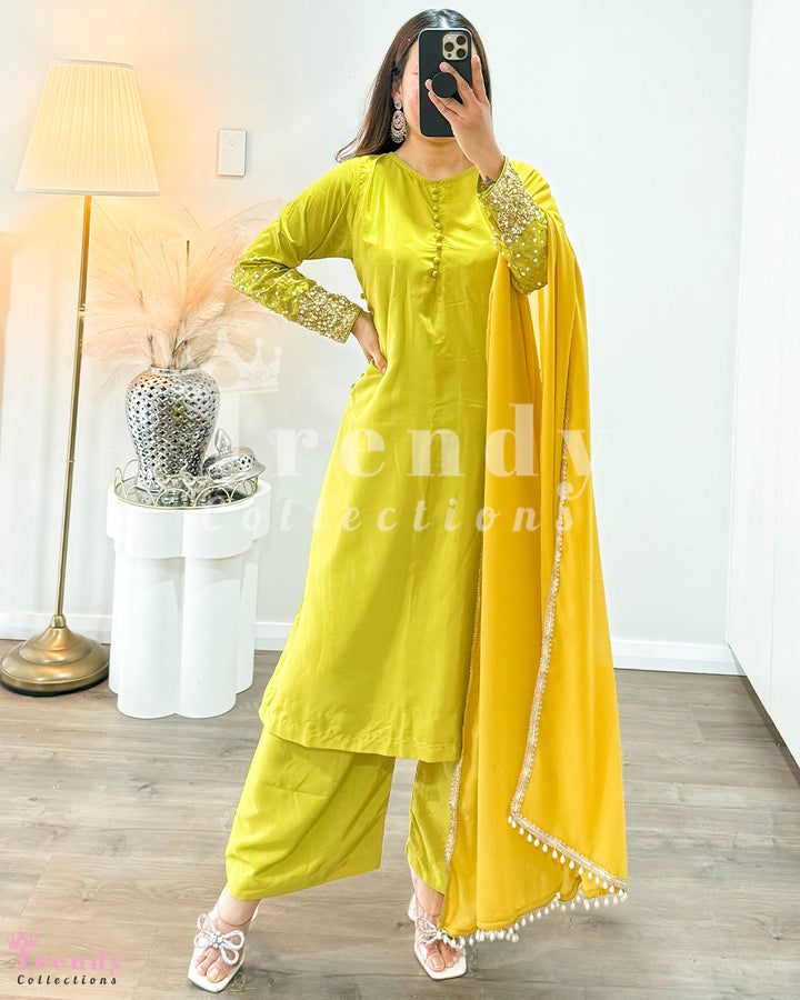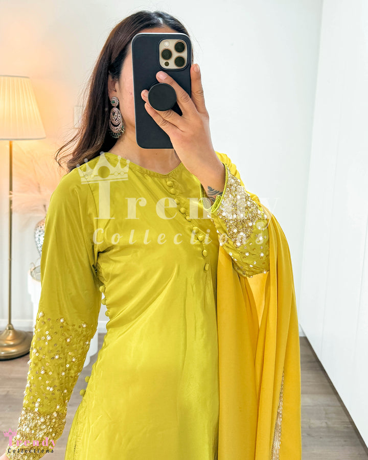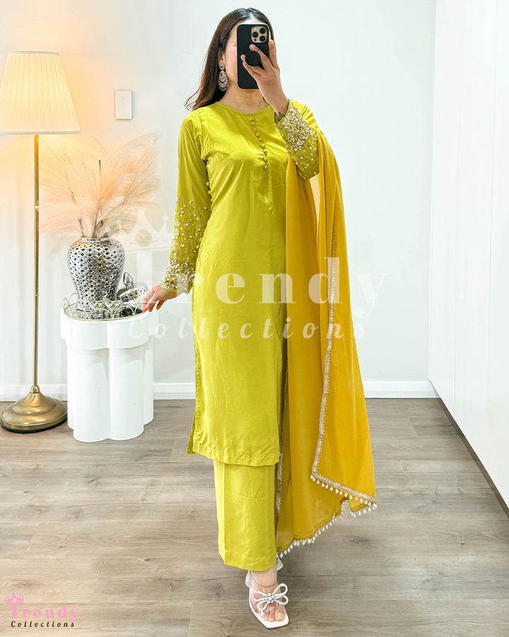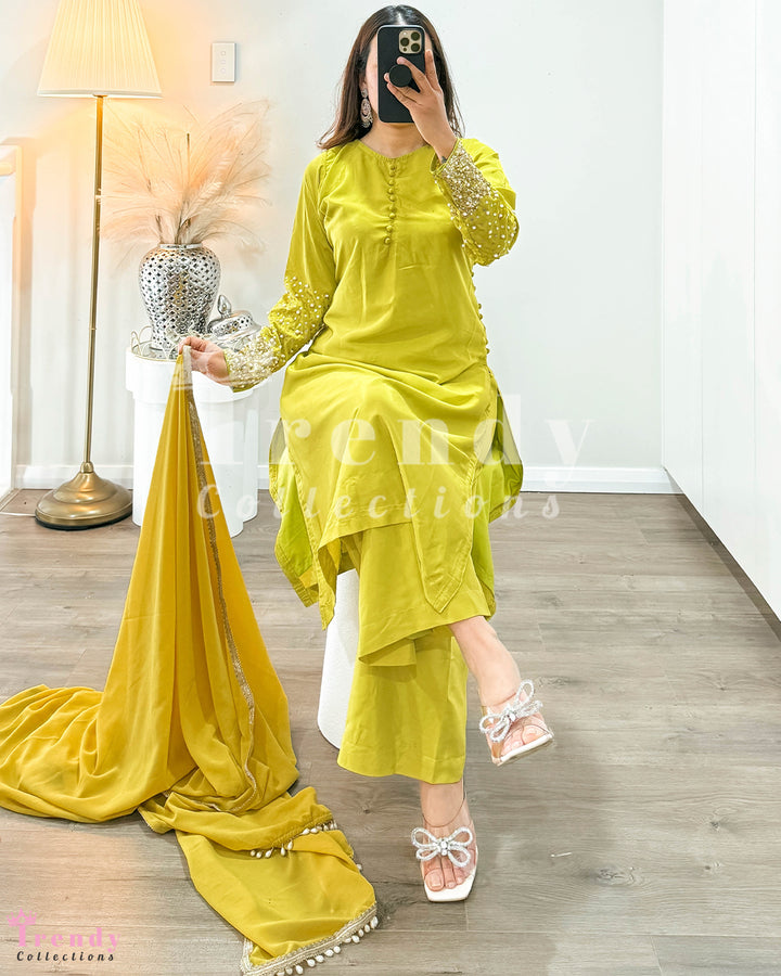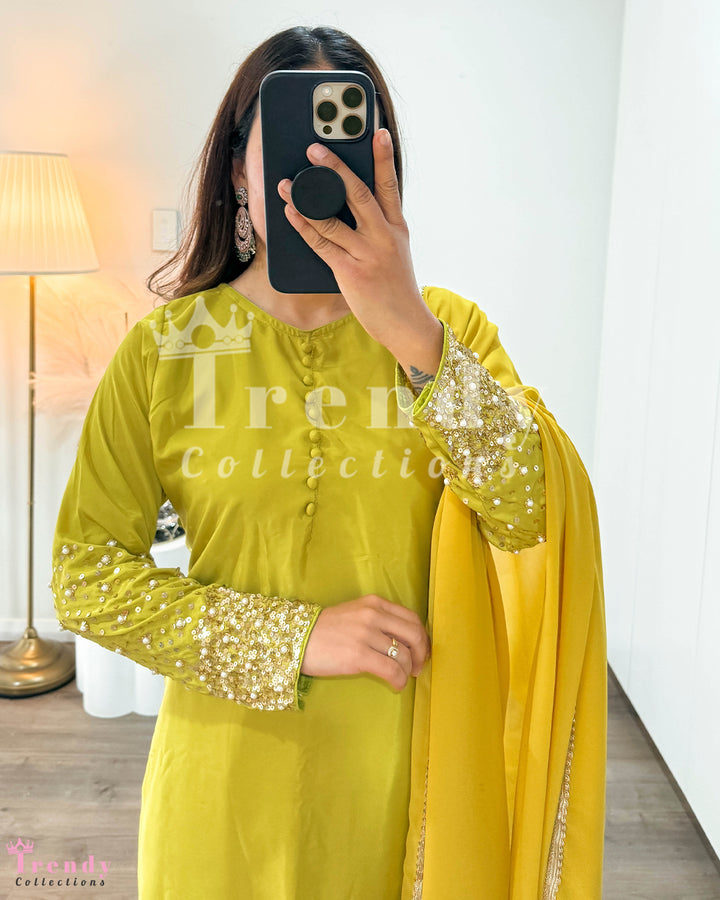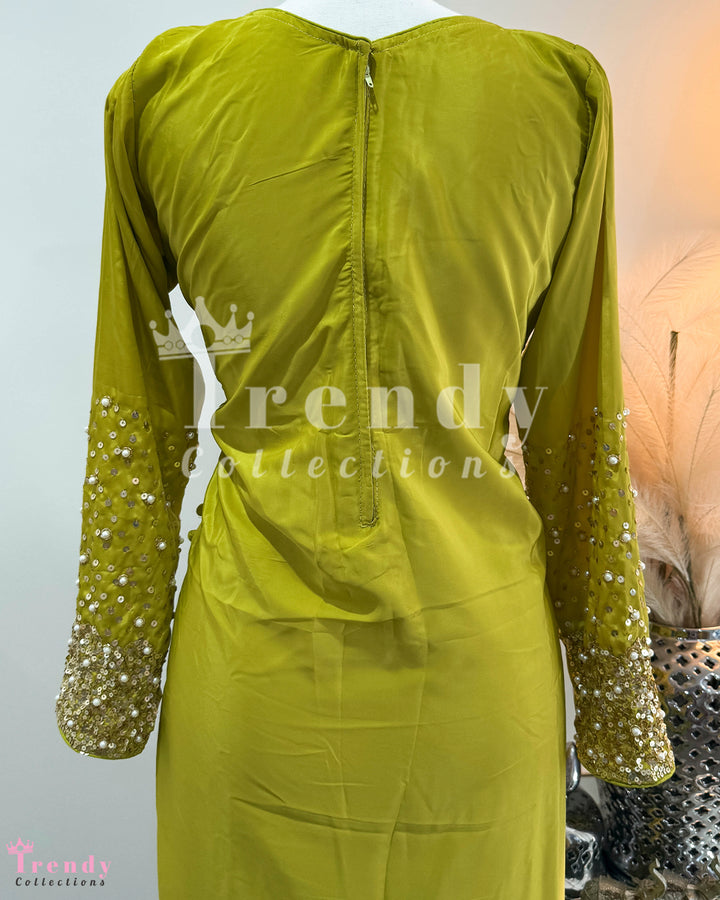 Hand Embroidered Kurtha Set - Hot Mustard Green (Sizes 34 - 38 Available)