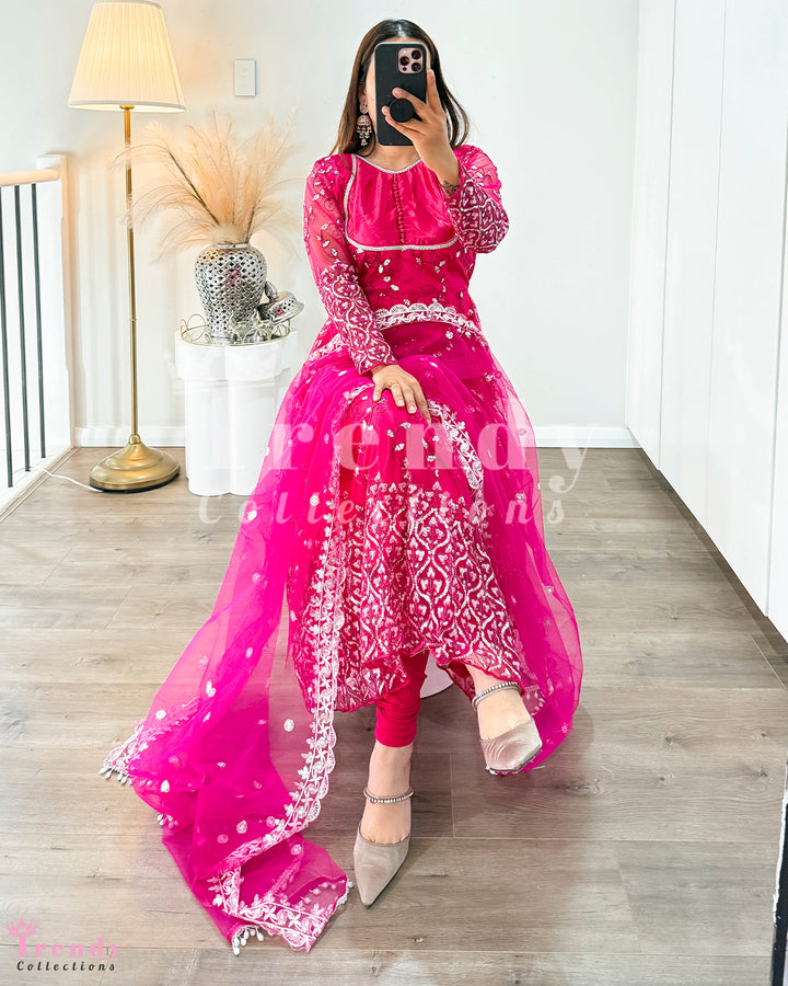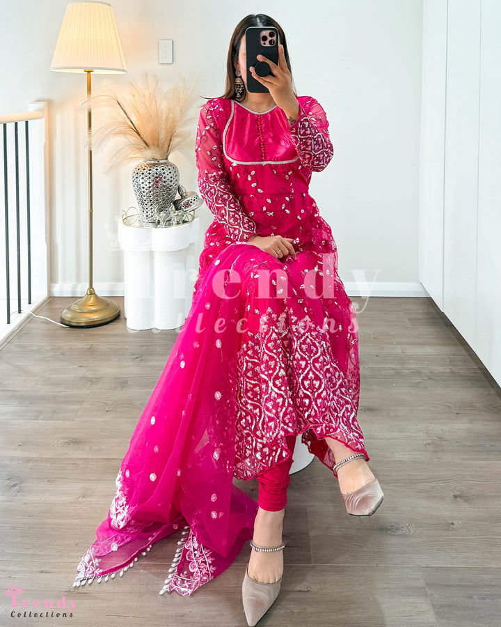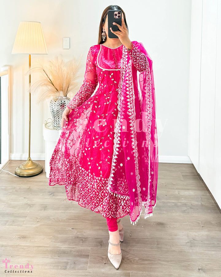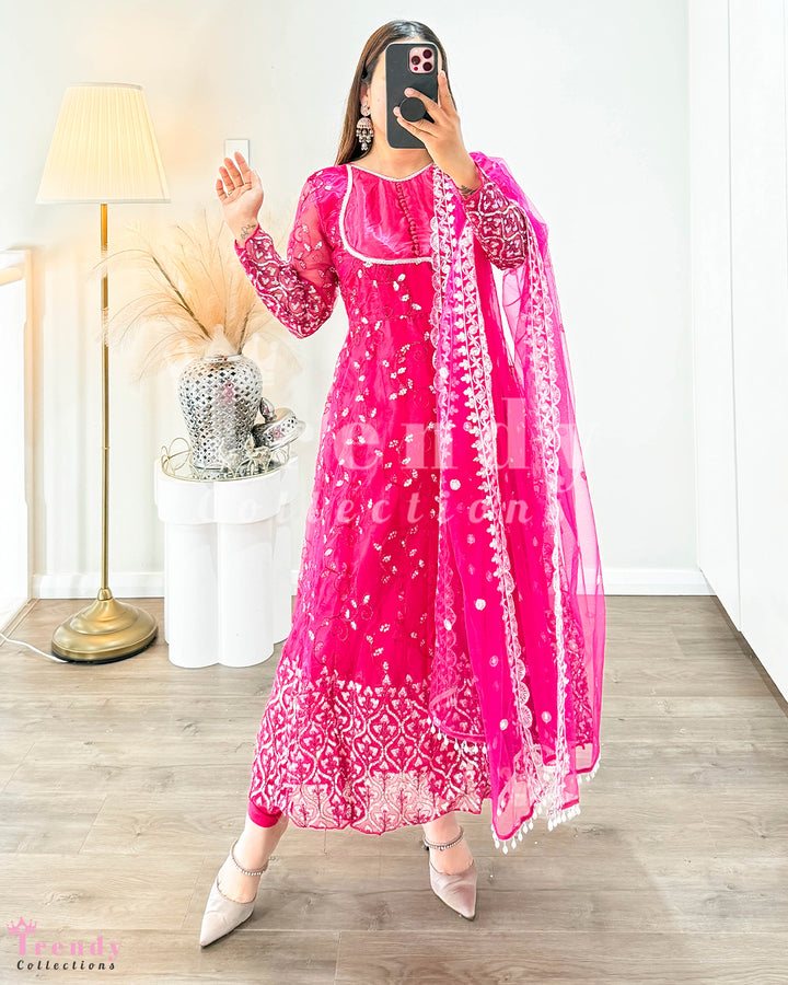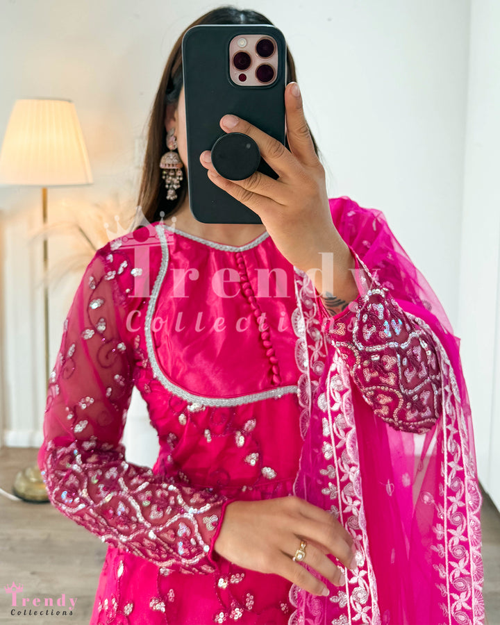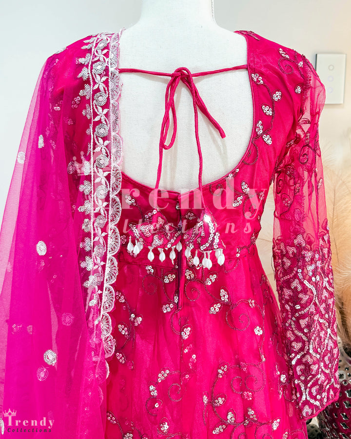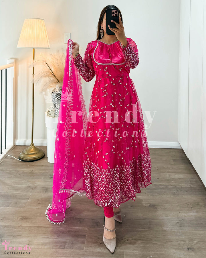 Net Anarkali Set with Zari & Sequin Work - Rani Pink (Sizes 32 to 42 available)