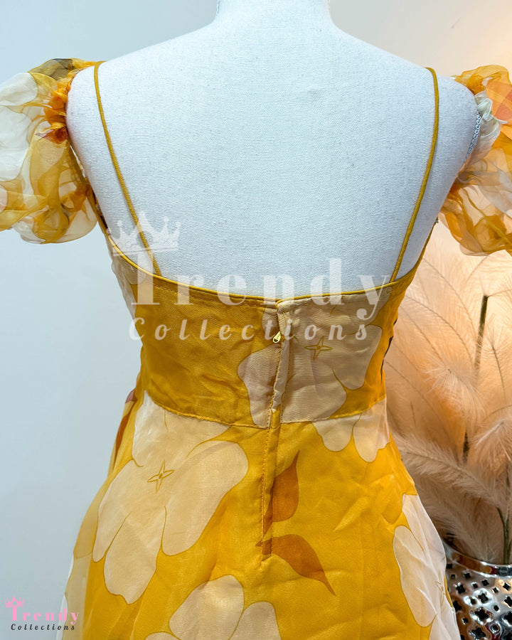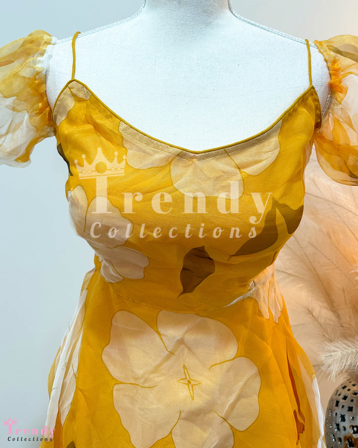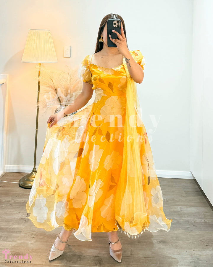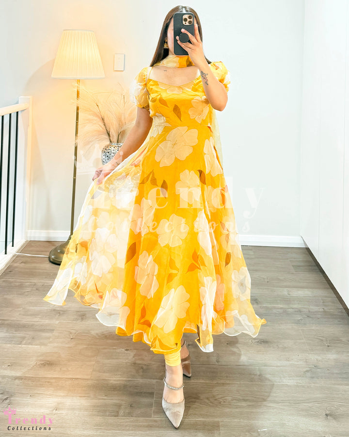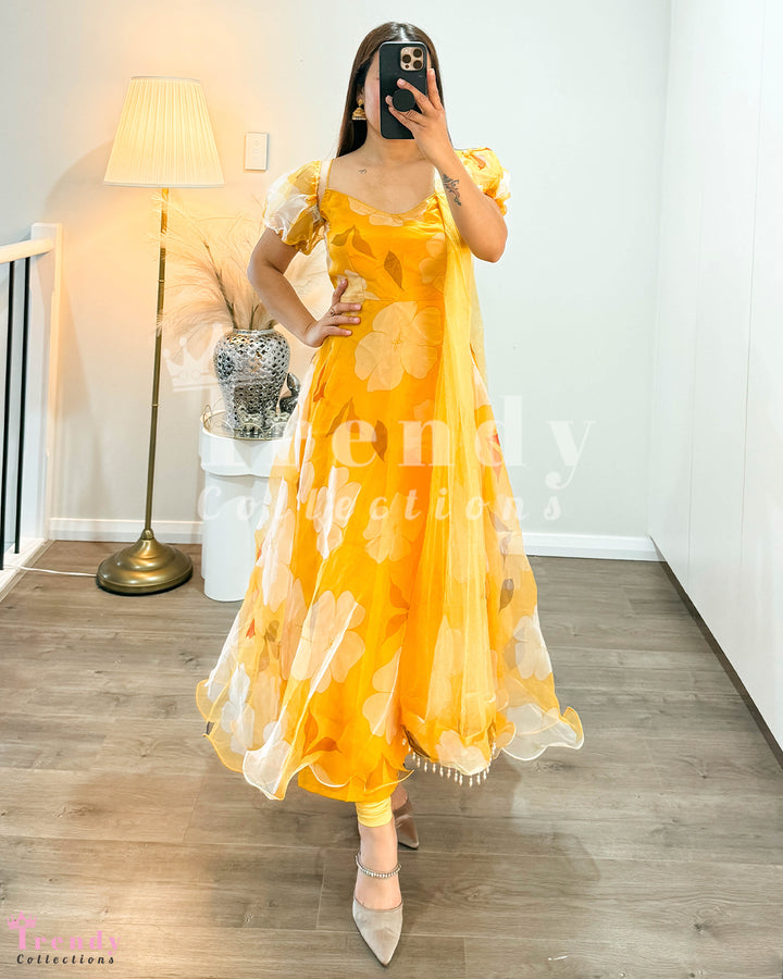 Organza Anarkali Set with Floral Print - Yellow (Sizes 32 to 38 available)