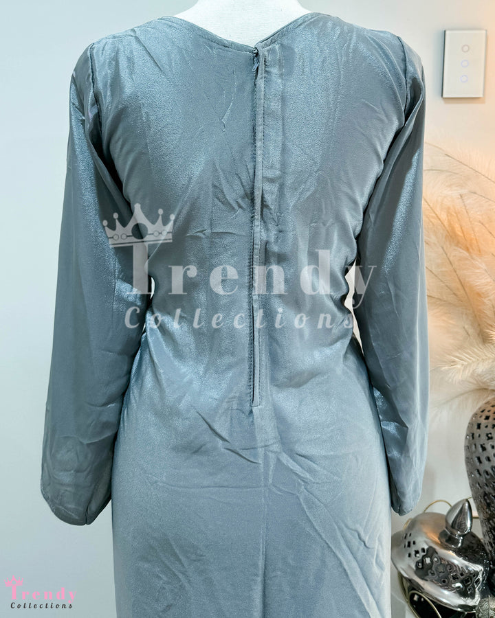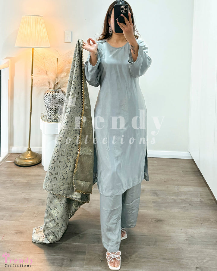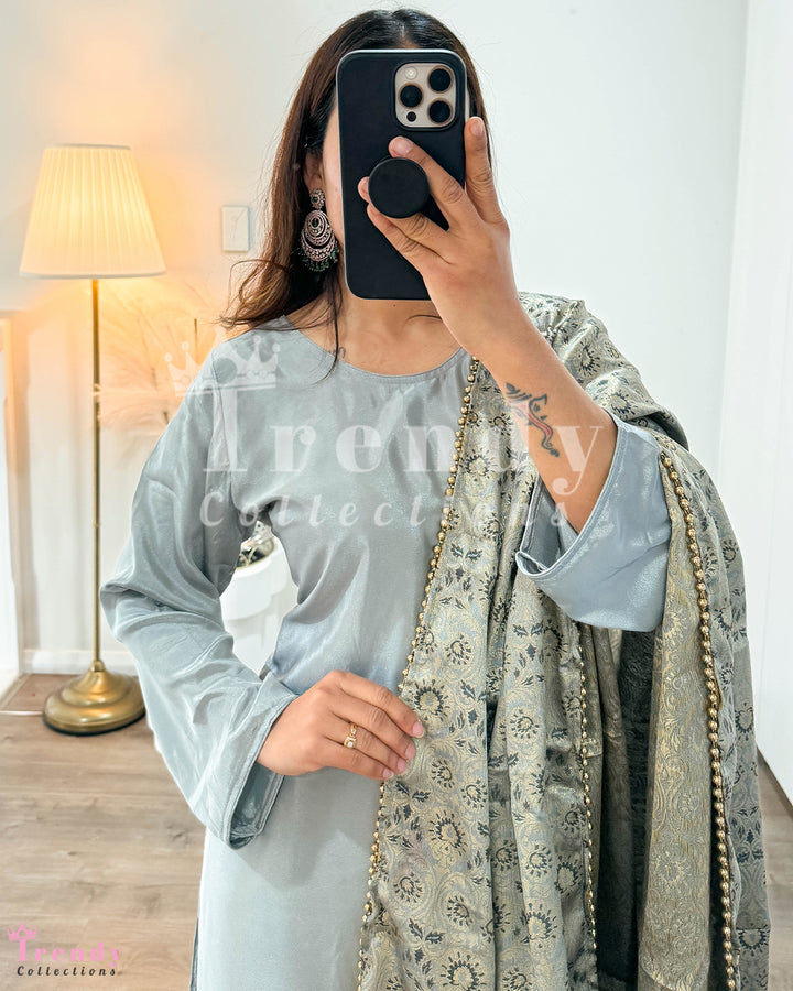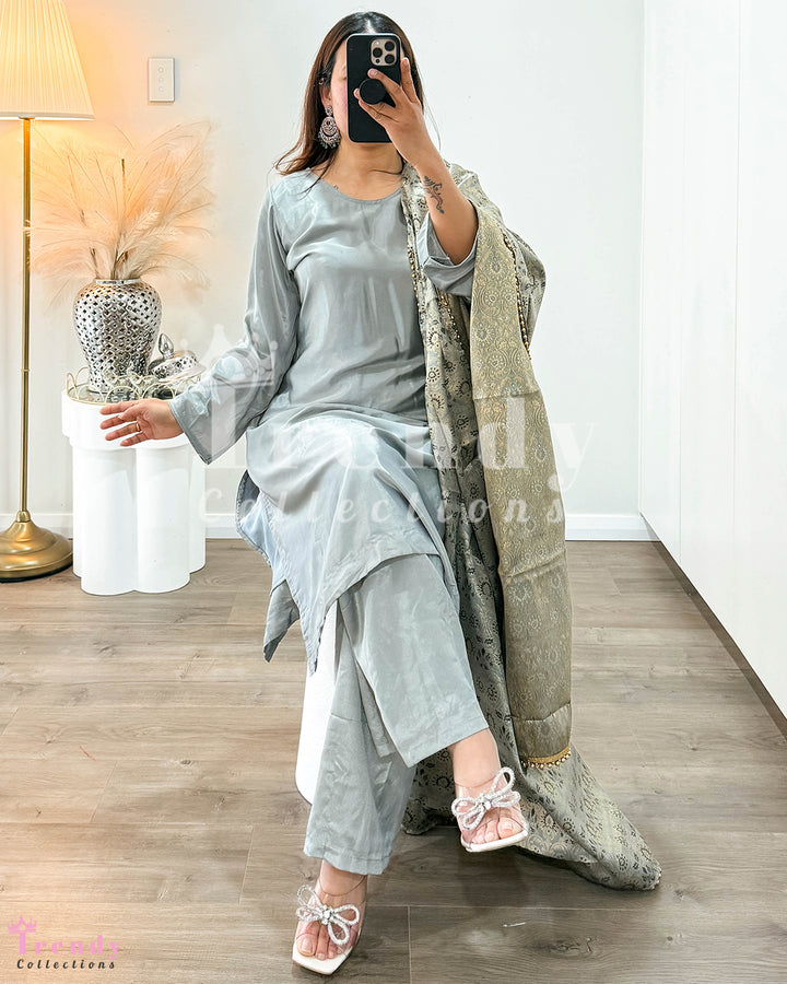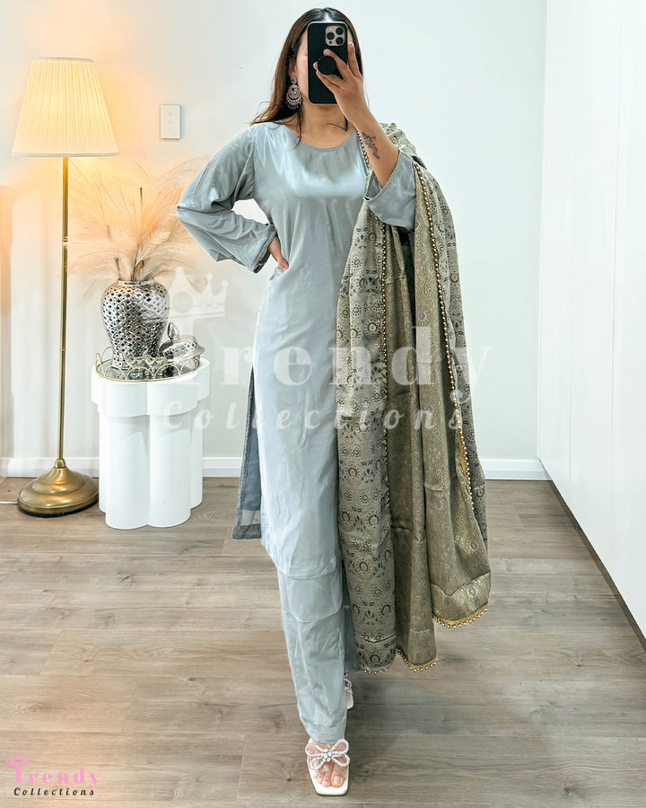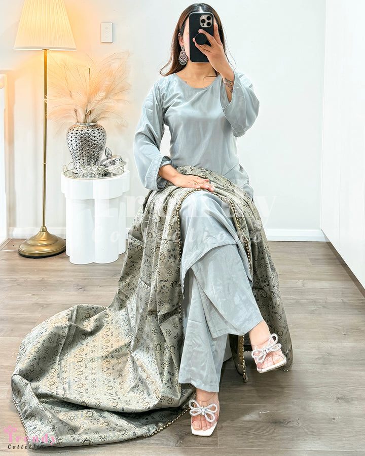 Soft Silk Kurtha Set with Heavy Shawl - Grey Blue (Sizes 34 - 40 Available)